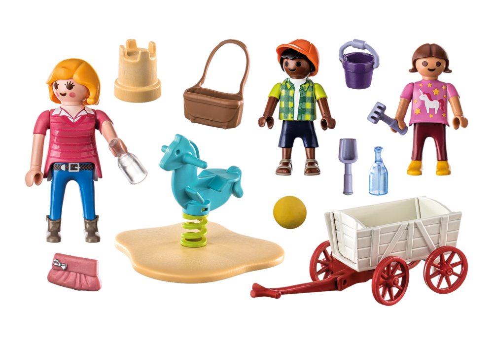 ชุดของเล่นประกอบด้วยฟิกเกอร์ PLAYMOBIL สามตัว รถลาก ของเล่นทราย กระเป๋า หมวก และอุปกรณ์พิเศษอื่นๆ สำหรับการสวมบทบาทไปในจินตนาการ สามารถเก็บขวดน้ำไว้ในกระเป๋าสะพายได้ ด้วยชุดเริ่มต้นที่ยอดเยี่ยมของ PLAYMOBIL คุณสามารถเข้าสู่โลกของ PLAYMOBIL ที่มีสีสันได้ ชุดประกอบด้วยฟิกเกอร์และอุปกรณ์เสริมสำหรับโลกธีม PLAYMOBIL ยอดนิยม