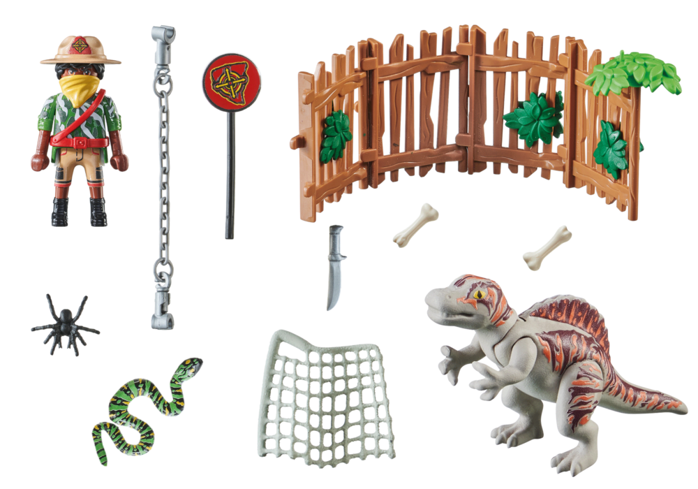 • ชุดของเล่นประกอบด้วยฟิกเกอร์ PLAYMOBIL สไปโนซอรัสทารก งู คุก และสิ่งพิเศษอื่นๆ สำหรับเกมสวมบทบาทที่น่าตื่นเต้น