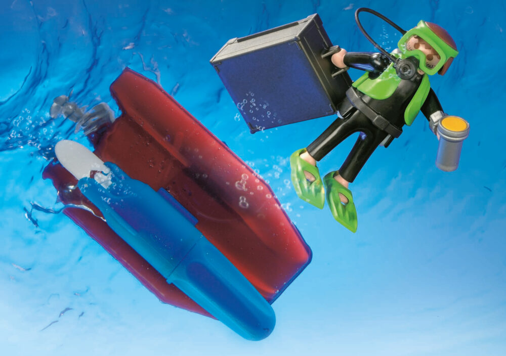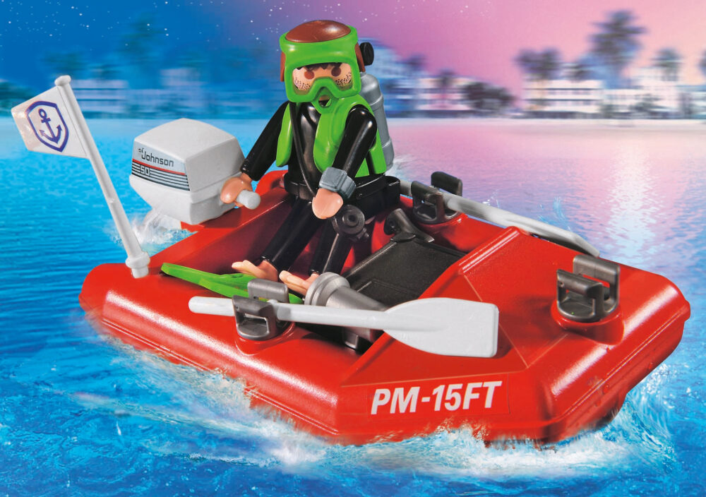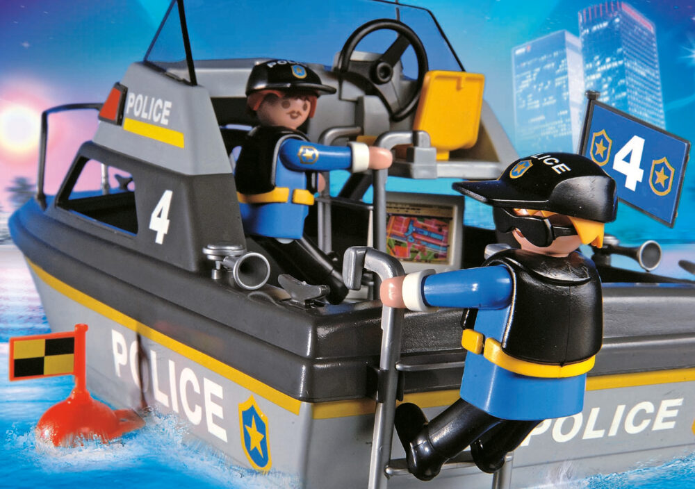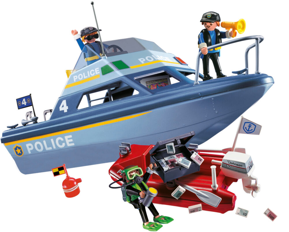 เรือตำรวจ Playmobil City Action ประกอบด้วยเรือตำรวจและเรือเล็กพร้อมพายและอุปกรณ์อื่นๆ ตำรวจสายน้ำกำลังออกลาดตระเวนด้วยเรือที่มีอุปกรณ์ครบครันพร้อม GPS โทรศัพท์ดาวเทียม และระบบลำโพงเสียงดัง เพื่อช่วยเหลือในภารกิจค้นหาและกู้ภัยทางทะเล มอเตอร์ใต้น้ำขับเคลื่อนพวกเขาอย่างรวดเร็วไปยังที่เกิดเหตุ ซึ่งขโมยได้ขุดพบเงินที่ซ่อนอยู่ภายในกระเป๋าเดินทาง โดยใช้เรือเล็กนอกเรือของเขา