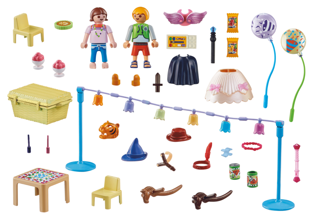 เตรียมพร้อมสำหรับงานปาร์ตี้เครื่องแต่งกายที่บ้าระห่ำที่สุดเท่าที่เคยมีมาด้วยชุดของขวัญปาร์ตี้เครื่องแต่งกาย PLAYMOBIL ใหม่ล่าสุด และสิ่งที่ดีที่สุด: คุณช่วยตัวเองไม่ให้มีกระดาษห่อของขวัญเพราะมันมาในบรรจุภัณฑ์ที่มีสไตล์! เด็กวันเกิดได้รับเชิญให้เข้าร่วมปาร์ตี้ชุดแฟนซีขั้นสุดยอด และด้วยเครื่องแต่งกายมากมาย เด็กๆ สามารถสวมบทต่างๆ เท่าที่จะจินตนาการได้ ไม่ว่าจะเป็นนักมายากลสวมหมวก เสื้อคลุมและไม้กายสิทธิ์ เจ้าหญิงสวมกระโปรง ที่คาดผมและคทา คาวบอยกับม้างานอดิเรก หรือชาวอินเดียที่คาดผม ขนนก และเกลียว – ความเป็นไปได้ไม่มีที่สิ้นสุด มีแม้กระทั่งเสือที่สวมหน้ากากและถุงมือ และนางฟ้าน่ารักที่มีปีก และเมื่อท้องของคุณร้อง แขกในงานปาร์ตี้เล็กๆ ก็สามารถนั่งลงที่โต๊ะเด็กๆ และเติมพลังให้ตัวเองด้วยไอศกรีมสตรอเบอร์รี่ เค้ก ขนมหวาน และน้ำผลไม้กระป๋อง ตะกร้าพับมีพื้นที่สำหรับเก็บเครื่องแต่งกายและเครื่องประดับ ด้วยชุดของขวัญนี้ ทุกปาร์ตี้จะกลายเป็นการผจญภัยสุดมันส์