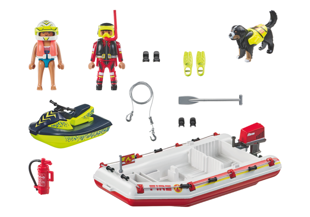 ขับเรือดับเพลิง PLAYMOBIL ใหม่ด้วย Aqua Scooter ผ่านภารกิจช่วยเหลือที่น่าตื่นเต้น! นักดับเพลิงพร้อมอุปกรณ์ดำน้ำช่วยคนขับเจ็ตสกีที่ได้รับบาดเจ็บ โดยได้รับการสนับสนุนจากสุนัขกู้ภัยทางน้ำที่ได้รับการฝึกมาเป็นพิเศษ เรือลอยน้ำมีสองที่นั่งพร้อมที่หนีบเท้า ไม้พาย และมอเตอร์ติดท้ายเรือแบบหมุนได้ หากวางฟิกเกอร์ไว้บน Aqua Scooter มันจะลอยอยู่บนน้ำได้ สุนัขมีหัวและหางที่สามารถขยับได้ และสวมเสื้อชูชีพแบบถอดได้ซึ่งหุ่นสามารถถือได้ โรงละครที่ยอดเยี่ยมสำหรับการแสดงบทบาทสมมติที่น่าตื่นเต้นและการช่วยเหลือทางน้ำอย่างกล้าหาญในห้องเด็ก ของขวัญหรือของที่ระลึกในอุดมคติสำหรับแอ็คชั่นฮีโร่ตัวน้อยอายุ 4 ปีขึ้นไป!