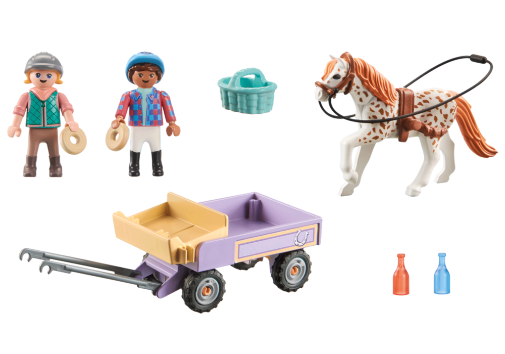 • ชุดของเล่นม้า PLAYMOBIL ที่น่ารัก พร้อมตัวละครเด็กสองตัว, โพนี่, รถม้าโพนี่, หมวกนิรภัย, ตะกร้าปิกนิก และอุปกรณ์เสริมอื่น ๆ ที่น่ารัก
