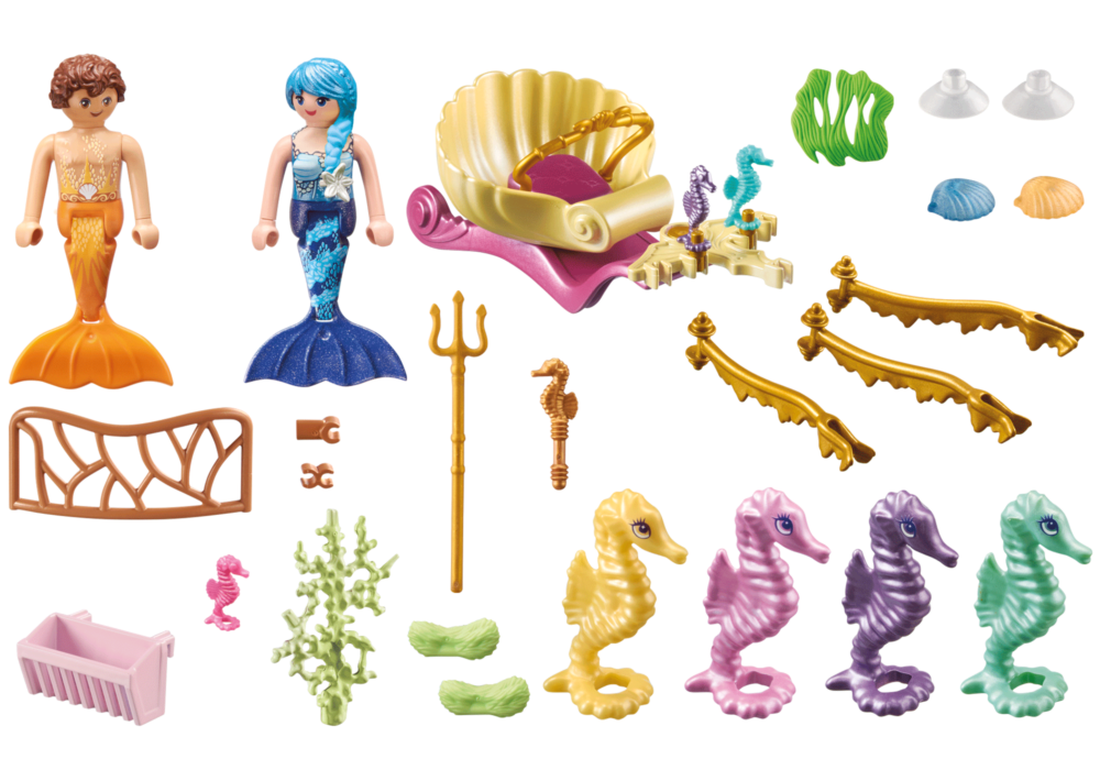 ดำดิ่งไปกับชุดของเล่น PLAYMOBIL สุดมหัศจรรย์ นางเงือกกับรถม้าน้ำ นอกจากม้าน้ำแล้ว นางเงือกยังสำรวจมหาสมุทรด้วยรถม้าใต้น้ำที่ส่องแสงระยิบระยับ การผจญภัยอะไรรอพวกเขาอยู่ในวันนี้? Princess Magic Mermaid World โดย PLAYMOBIL เชิญชวนเด็กๆ เข้าสู่อาณาจักรใต้น้ำที่มีมนต์ขลัง รูปปั้นและสัตว์ต่างๆ ที่สร้างขึ้นด้วยความรักเป็นแรงบันดาลใจให้เด็กอายุ 4 ปีขึ้นไปออกผจญภัยในจินตนาการ ในชุดประกอบด้วยฟิกเกอร์ PLAYMOBIL สองตัว ม้าน้ำขนาดใหญ่สี่ตัว รถม้าใต้น้ำ และอุปกรณ์เสริมอื่นๆ อีกมากมาย เปลือกตกแต่งสามารถติดบนพื้นผิวเรียบได้อย่างง่ายดายด้วยถ้วยดูด