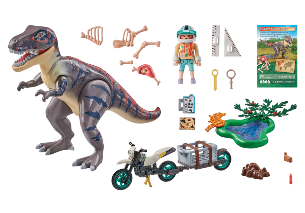 •ชุดไดโนเสาร์ PLAYMOBIL สุดเจ๋งกับนักวิจัย PLAYMOBIL, ไทแรนโนซอรัส เร็กซ์, มอเตอร์ไซค์พร้อมรถพ่วง, แอ่งน้ำที่มีรอยเท้า, แว่นขยาย, กล้อง, แผนที่ และอุปกรณ์วิจัยอื่น ๆ