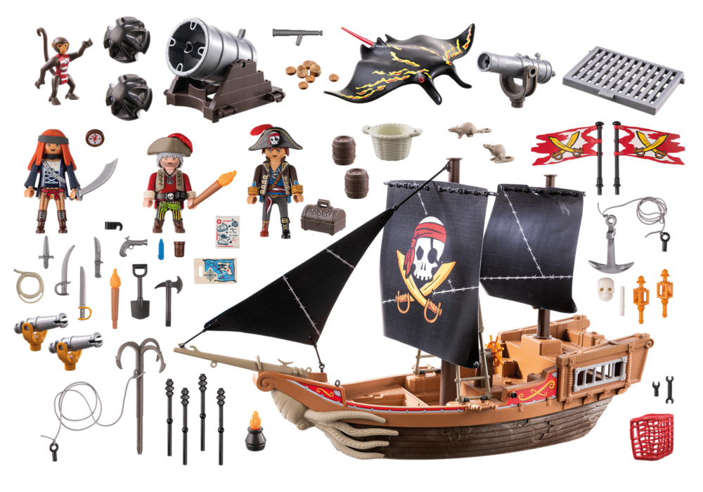 แฟนโจรสลัด เตรียมตัวสำหรับการผจญภัยของโจรสลัดที่น่าตื่นเต้นกับเรือโจรสลัดขนาดใหญ่พร้อมลูกเรือจาก PLAYMOBIL! เรือใบลอยน้ำลำนี้ติดตั้งปืนใหญ่หมุนได้ ปืนใหญ่ขนาดใหญ่ที่วางได้อย่างอิสระ และมีพื้นที่มากมายสำหรับลูกเรือโจรสลัดผู้กล้าหาญ ด้วยที่หนีบเท้าที่ใช้งานได้จริง ทำให้หุ่นสามารถยืนบนเรือได้อย่างปลอดภัย ใบเรือยังเคลื่อนย้ายได้ และใบเรือสามารถกางออกได้ทั้งสองด้าน ตัวถังลอยน้ำที่ผสานอยู่บนดาดฟ้าช่วยป้องกันไม่ให้เรือจม แม้ว่าเรือจะเต็มไปด้วยน้ำก็ตาม