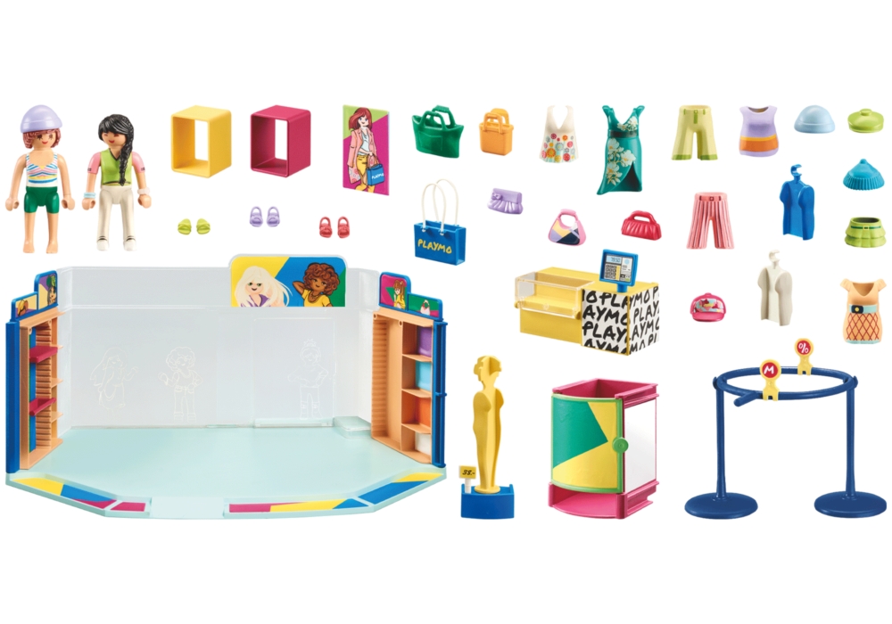 มาสนุกกับการช้อปปิ้งกับร้านค้าแฟชั่นสุดทันสมัยจาก PLAYMOBIL ชุดของเล่นแสนสนุกนี้เชิญชวนเด็กๆ ให้ดื่มด่ำไปกับโลกแห่งการช้อปปิ้งของตัวเอง ร้านแฟชั่นเก๋ๆ มอบโอกาสมากมายสำหรับการแสดงบทบาทสมมติอย่างสร้างสรรค์: ที่ชั้นใต้ดินคุณสามารถดูและเลือกเสื้อผ้าและเครื่องประดับได้ และที่ชั้นบนคุณสามารถลองชุดใหม่ ๆ ในห้องเปลี่ยนเสื้อผ้าและตรวจดูพวกเขาที่หน้ากระจกตั้งพื้น ด้วยตัวเลือกที่หลากหลาย ทำให้สามารถรวมชุดค่าผสมใหม่เข้าด้วยกันได้ตลอดเวลา ความสนุกที่ยอดเยี่ยมสำหรับแฟนแฟชั่นตัวน้อยอายุ 5 ปีขึ้นไป