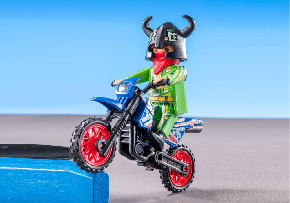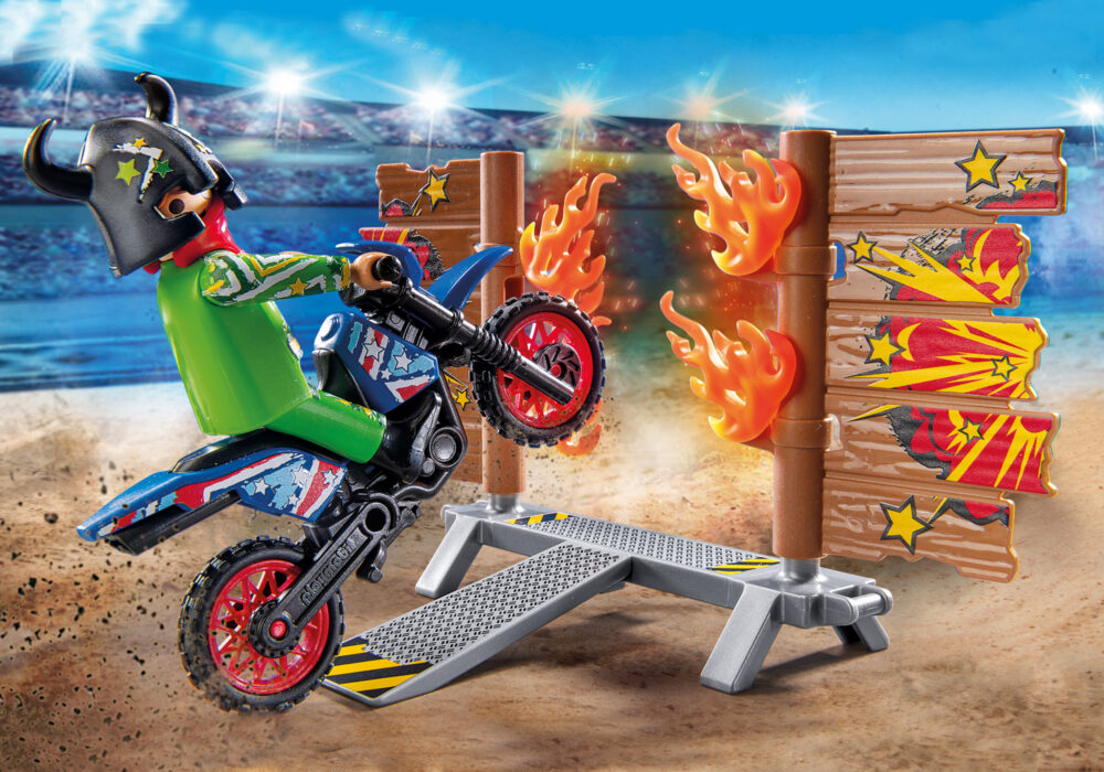 รางกระโดดขนาดใหญ่รอให้เหล่านักบิดสุดกล้าทำท่าท้าทาย! ใครจะกล้ากระโดดผ่านกำแพงไม้หรือเปลวไฟ? ชุดนี้มาพร้อมมอเตอร์ไซค์สตันท์, ควอดไบค์พร้อมมอเตอร์ดึงถอย, นักบิดสองคน และอุปกรณ์เสริมมากมาย