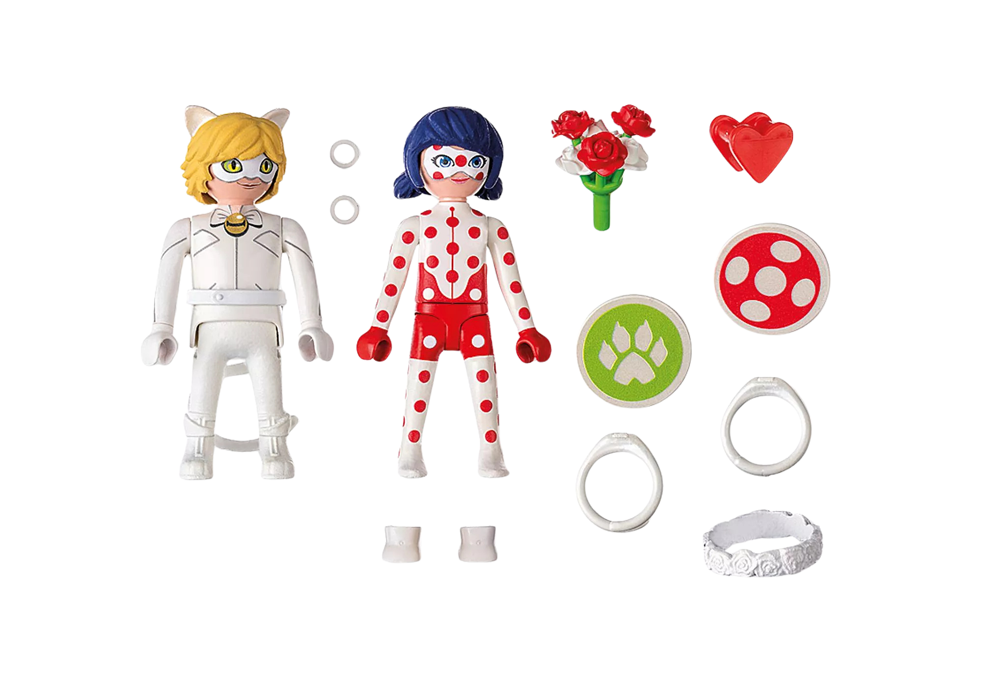 * ตัวละคร Ladybug และ Cat Noir ในชุดแต่งงานสีขาว พร้อม **หัวใจที่ทั้งคู่จับไว้ด้วยกัน**