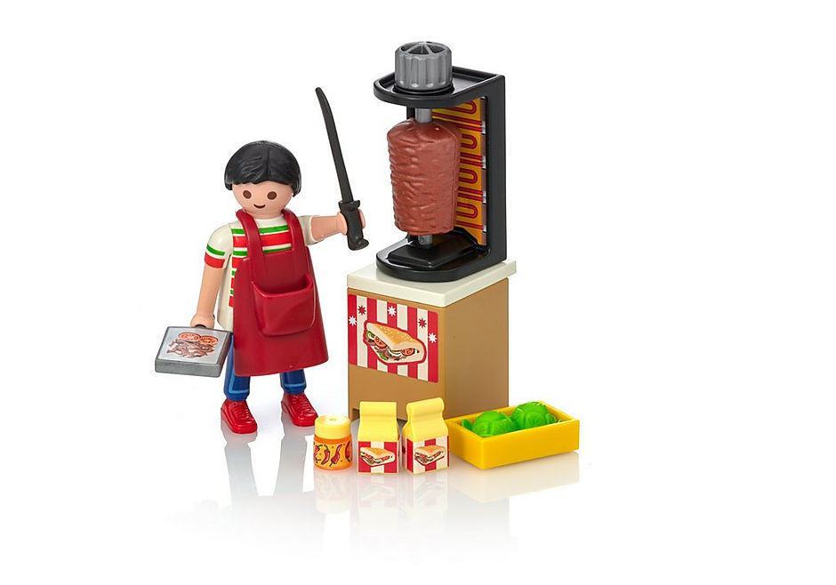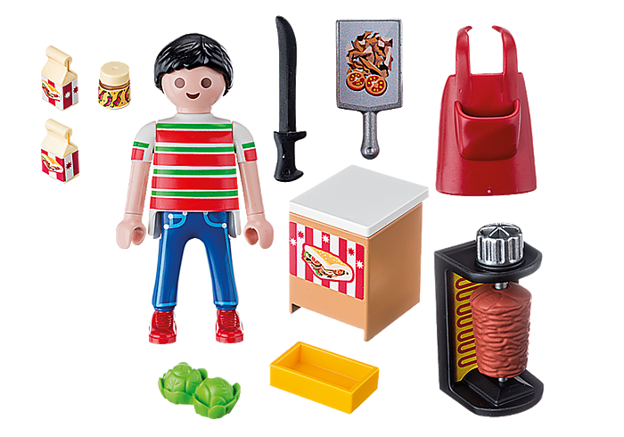 Playmobil Kebab คนขายเคบับพร้อมที่จะให้บริการลูกค้าคนต่อไปของเขาแล้ว เขามีเนื้อสดๆกับตะกร้าที่เต็มไปด้วยผักกาดหอม นอกจากนี้ยังมีกล่องเครื่องดื่มและซอสปรุงรส พร้อมสำหรับการทำเคบับที่สมบูรณ์แบบ! ให้บริการอาหารแสนอร่อยแก่ลูกค้าของคุณ และ เพิ่มเครื่องดื่มหรือซอสเพื่อเพิ่มความอร่อยให้กับเคบับมากขึ้นไปอีก ในชุดประกอบด้วย ฟิกเกอร์หนึ่งตัว เนื้อเคบับ มีดหั่นเนื้อ ตะกร้า ผักกาดหอม กล่องเครื่องดื่ม ซอสปรุงรส และอุปกรณ์เสริมอื่นๆ