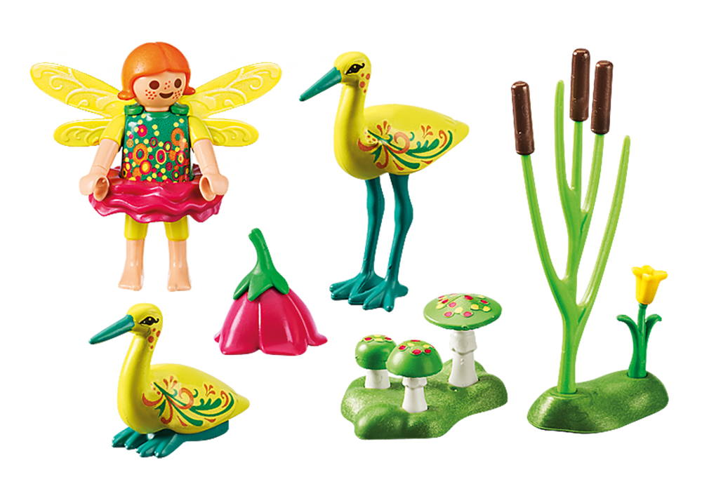 ในชุดมีนางฟ้าสาวกำลังเล่นกับนกกระสาหญิงสาวสวมชุดสีสันสดใสและหมวกดอกไม้ต้นกกและเห็ดยาวให้การปกป้องนกกระสารวมถึงฟิกเกอร์ Playmobil หนึ่งตัวและนกกระสาสองตัวส่งเสริมการเรียนรู้ผ่านการเล่นแบบโต้ตอบ