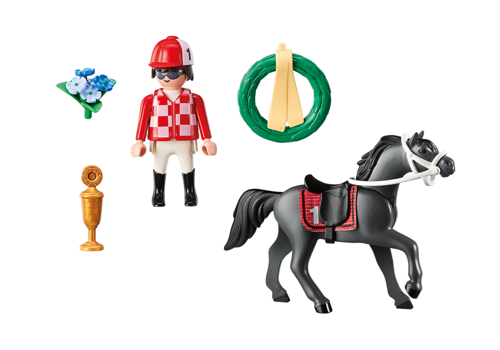 เตรียมตัวให้พร้อมแข่งกับ Playmobil 9261 Jockey! เขาได้รับรางวัลถ้วยใหญ่และรางวัลในการแข่งม้ารับถ้วยรางวัลกลับบ้านด้วยรางวัลใหญ่พร้อมกับชุดจ๊อกกี้