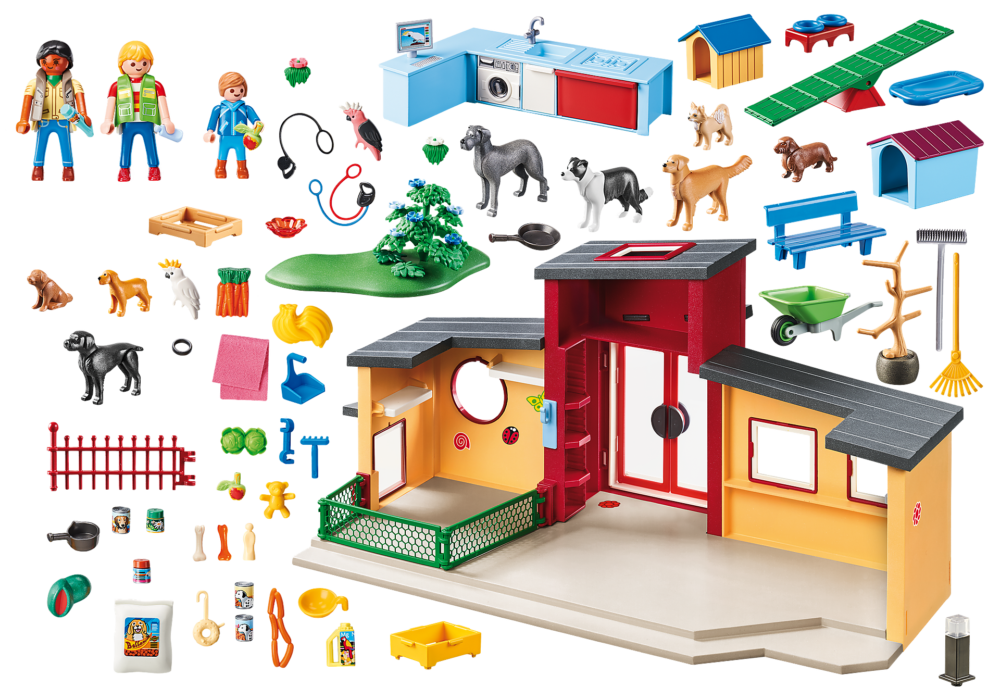 เพลย์โมบิล แพทโฮเตล โรงแรมสัตว์เลี้ยง สุนัขชอบปีนบนกระดานหกในพื้นที่เล่นกลางแจ้ง โรงแรมสัตว์เลี้ยงมีบริเวณแผนกต้อนรับ ห้องครัวและอุปกรณ์เสริมมากมาย รั้วกลางแจ้งมีความยืดหยุ่น