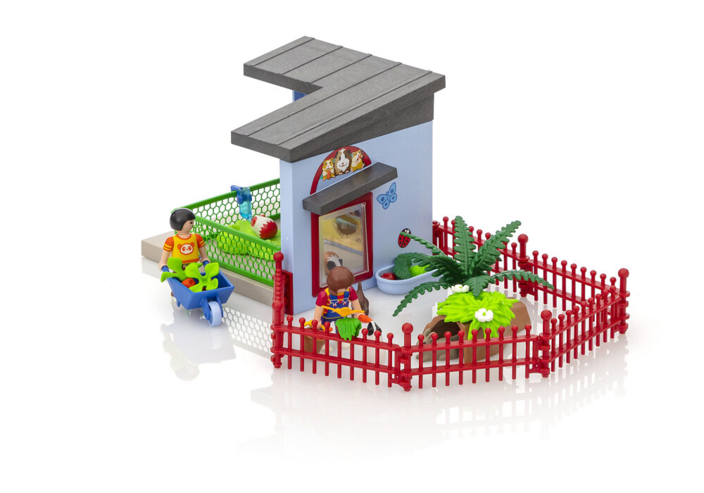 พื้นที่ที่สะดวกสบายสำหรับแฮมสเตอร์และหนูตะเภาด้วยกรงกลางแจ้งที่กระต่ายเล่น รวมถึงล้อวิ่งหนูแฮมสเตอร์