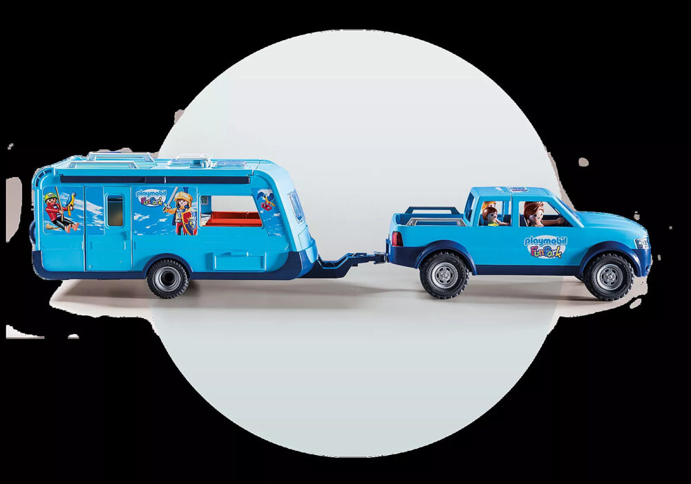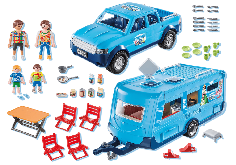ทริปแคมป์ปิ้งกับครอบครัว ปิ๊กอัพแบบมีหางพ่วง หลังคาถอดได้ และประตูท้ายที่เปิดออกได้ แคมป์พร้อมกันสาด ฐานรองรับด้านหลัง และหลังคาที่ถอดออกได้ แคมป์มีเตียงสองชั้นสำหรับเด็ก ห้องน้ำที่มีประตูบานเลื่อน มุมครัวและพื้นที่นั่งเล่น และมีพื้นที่กว้างขวางสำหรับเก็บอุปกรณ์เสริม กลุ่มที่นั่งสามารถปรับเป็นที่นอนสำหรับผู้ปกครองได้ รวมอุปกรณ์แคมปิ้ง. ขนาดรถปิคอัพและแค้ม: 57 x 12 x 13 ซม. (LxDxH)
